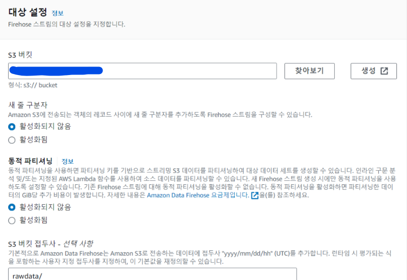 S3도 똑같이 생성했던 S3를 선택하여 arn주소를 넣어주고, api요청으로 오는 데이터를 받아볼 것이니 S3 버킷 접두사에 rawdata/로 설정해줍니다.