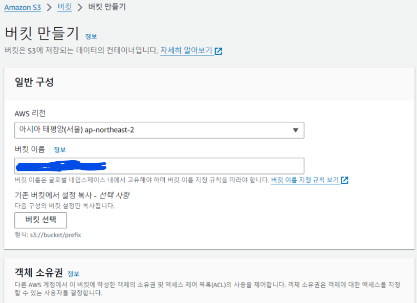 이 때 S3는 전 세계 공통으로 고유한 이름이어야 합니다. 리전 상관없이 다른 S3버킷과 이름이 겹칠 수 없습니다.