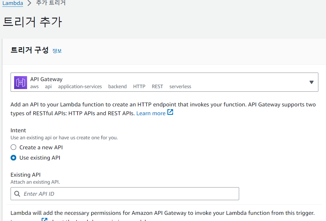 마지막으로 api요청을 감지하여 Lambda를 작동시킬 트리거를 생성하면 됩니다.