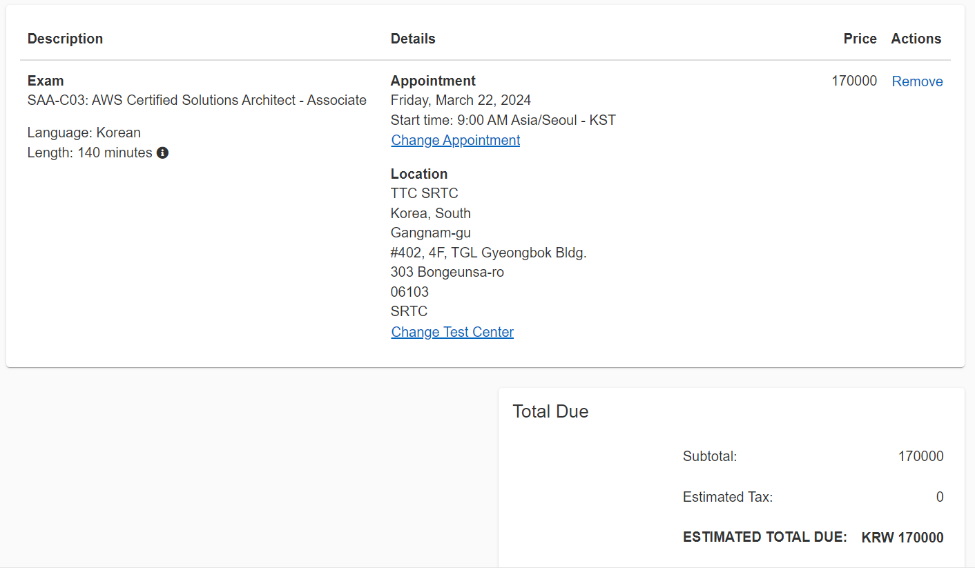 AWS의 SAA시험이 굉장히 좋았던 게, 정처기같이 1년에 2~3번정도가 아닌 상시 시험이라 당장 2일후의 시험도 예약 가능했다.