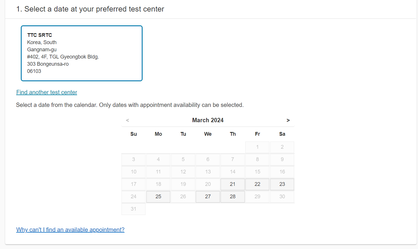 SCHEDULE버튼을 누르면 본격적으로 시험 일정 예약 사이트로 접속된다.
