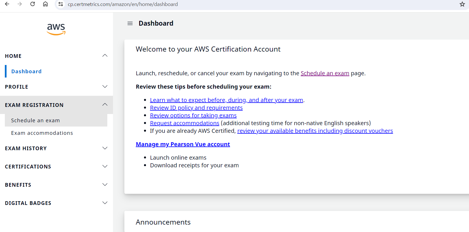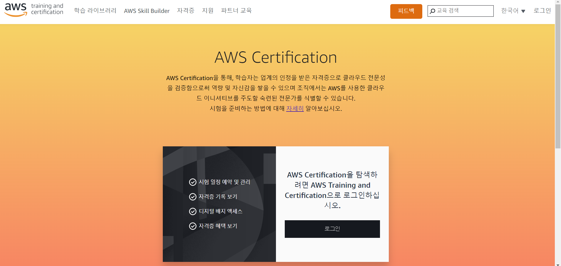 시험 등록은 아래 AWS Certification으로 접속해서 로그인하고, 접수할 수 있었다.