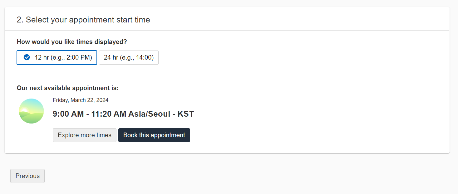 날짜를 선택하면 시험 시간도 선택하면 됐다. 9시시작인 1가지 옵션만 있어서 이걸로 했다.