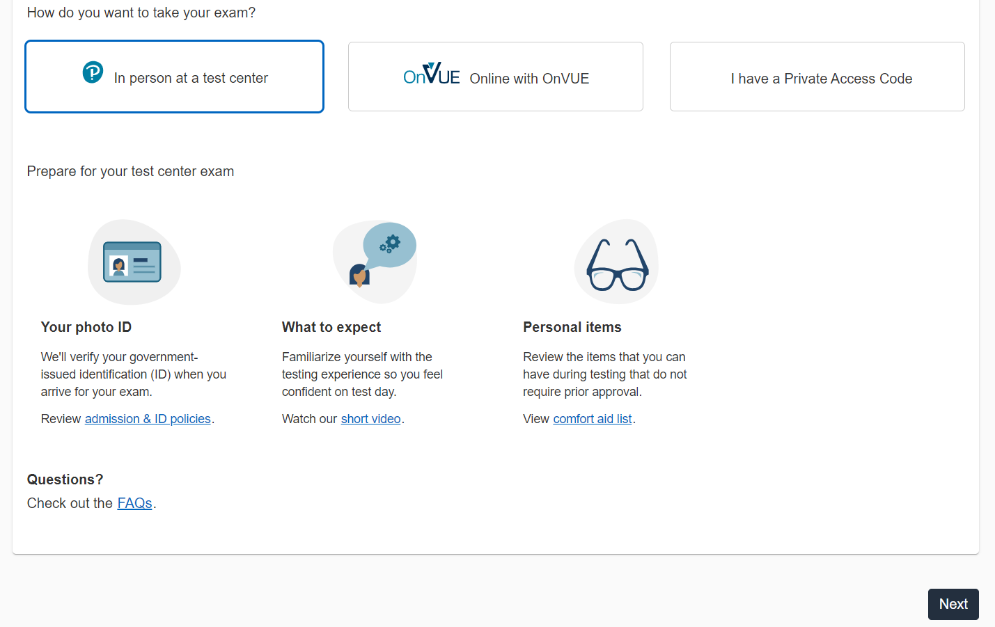 나는 오프라인으로 센터에 방문해서 시험치는 방식을 택할 것이라 왼쪽의 in person at a test center