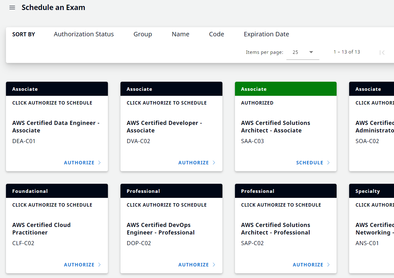 AWS의 여러 자격증들 중 SAA-C03에 해당하는 녀석을 클릭해주면 된다. 시험을 처음 등록하는 거면 Autorize라는 버튼이 있어서, 이녀석을 클릭만 해주면 상태가 Autorized로 바뀌면서 시험 예약이 가능해진다.