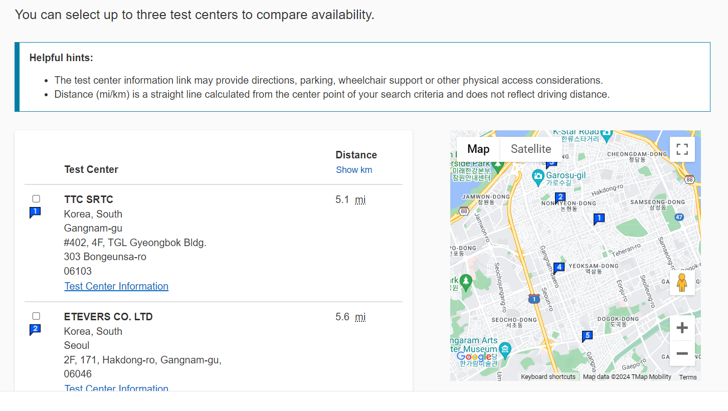영어로 네이버 지도에 검색해도 잘 안나올 것 같은 낯선 이름의 센터들이 주루룩 뜬다.(실제로도 안뜬다) 나는 가장 위에 있는 SRTC 센터가 가기 편하기도 하고 선정릉역 근처라 끝나고 T1사옥 구경할 생각에(페이커 기습숭배) 이 곳으로 정했다.