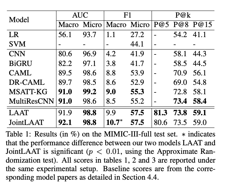 a. LR,SVM,CNN,BIGRU ->(attention mechanism) CAML -> (not fixed window size) MASATT-KG,MultiResCNN -> LAAT 순으로 우수한 성능을 보임.