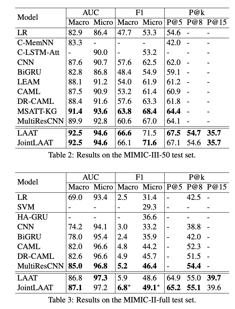 b. JointLAAT가 macro-AUC, macro-F1에서 LAAT보다 우수한 성능을 보임 => JointLAAT는 LAAT보다 infrequent codes에서 우수한 성능을 가짐을 보여줌.