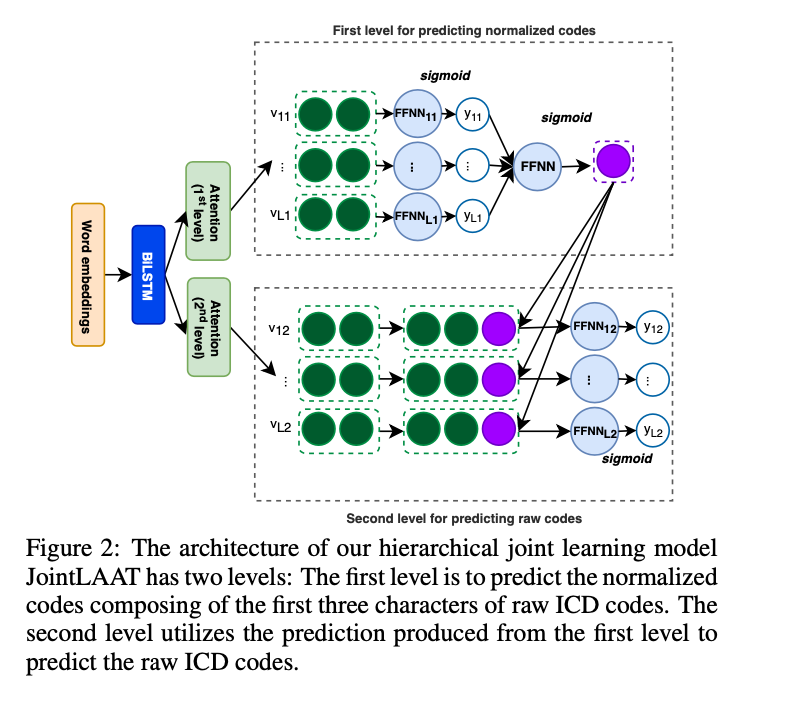 second level : utilize the prediction produced from the first level to predict the raw ICD codes.