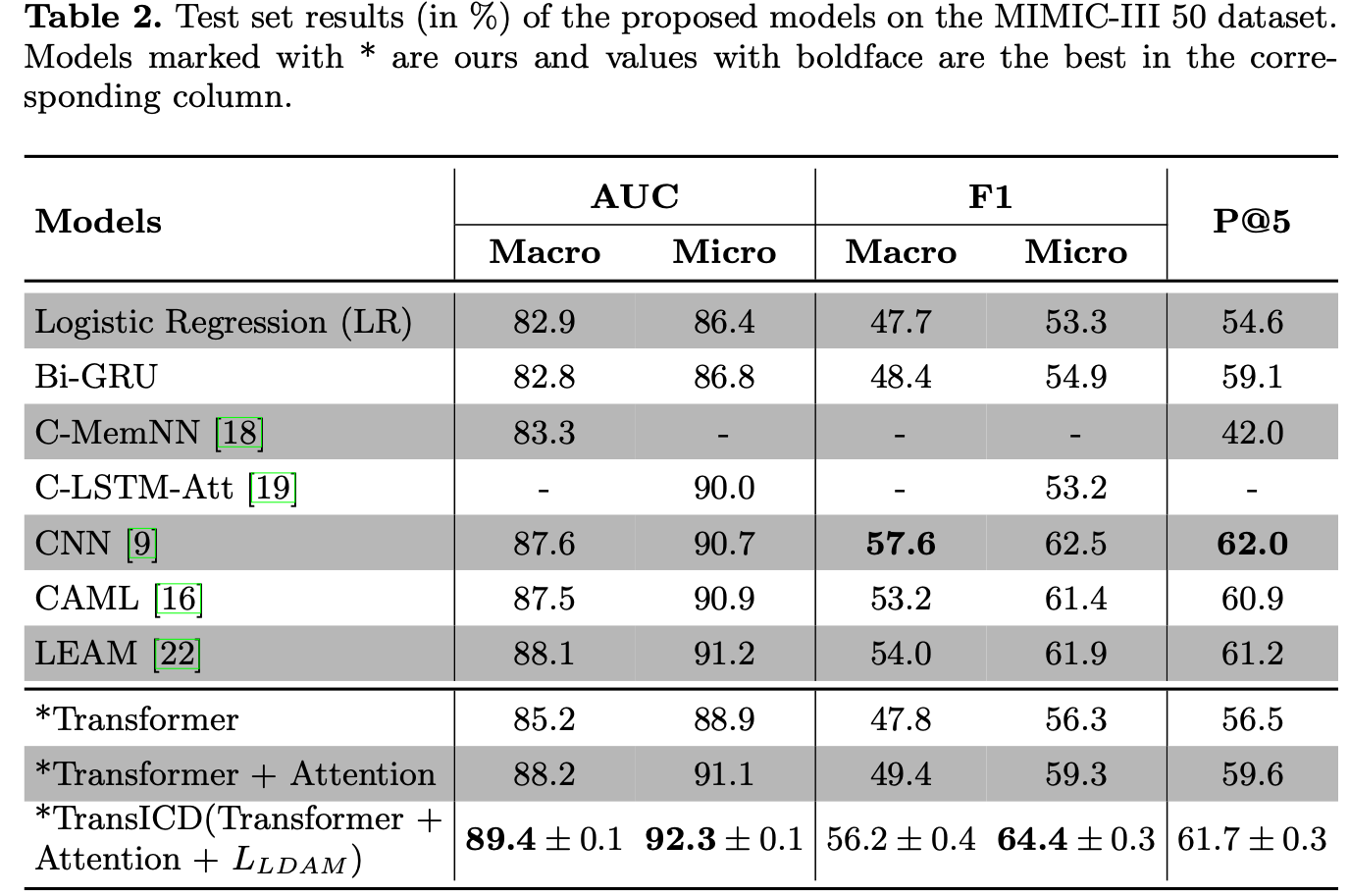 4. Code-wise attention과 LDAM Loss 를 이용한 TransICD는 대부분 baseline모델들 보다 우수한 성능을 보였지만, F1 Macro에서는 CNN 다음의 위치를 차지함.
