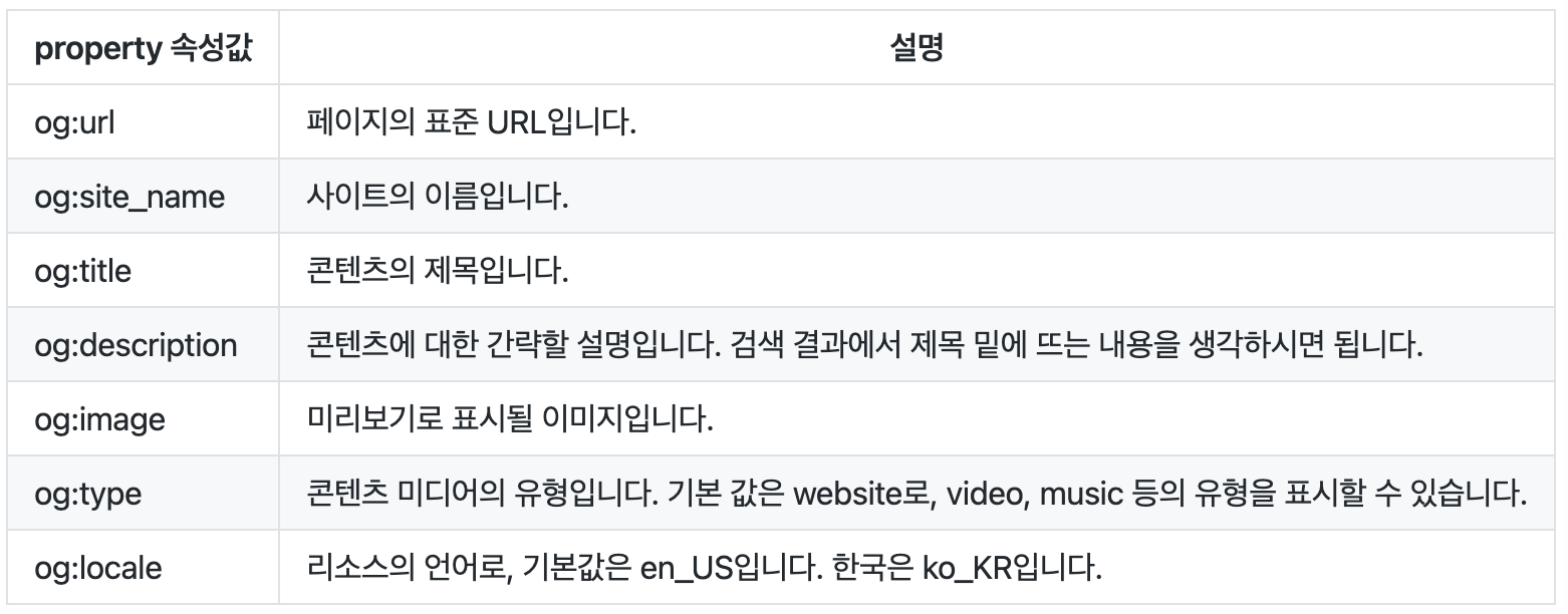 소셜 미디어나 채팅 애플리케이션에서 링크를 공유했을 때 뜨는 링크 미리보기와 관련 정보도 이 <meta>요소에 들어가 있는 내용이다.