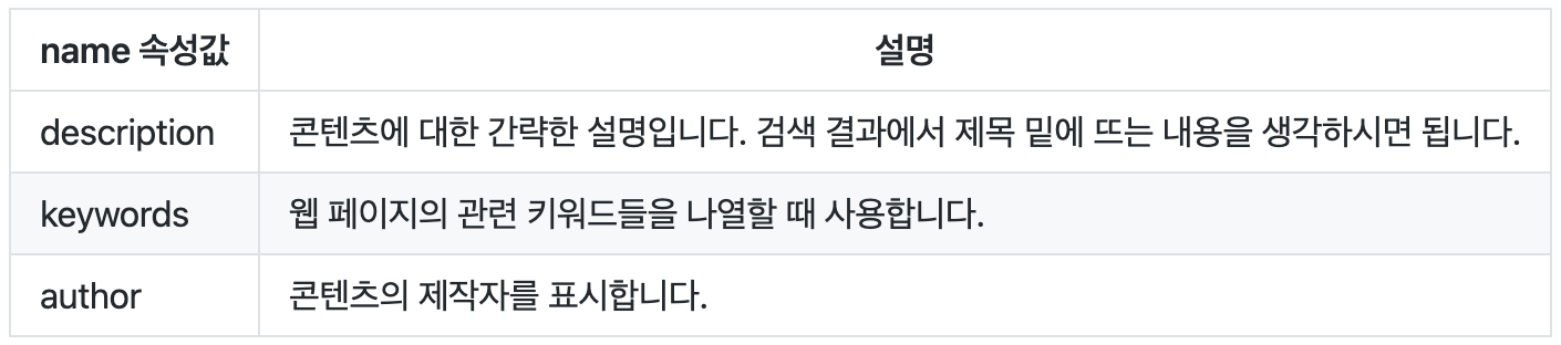 첫 번째 경우는 name 속성을 사용하며, SEO를 위해서 사용하는 것이 목적이다.