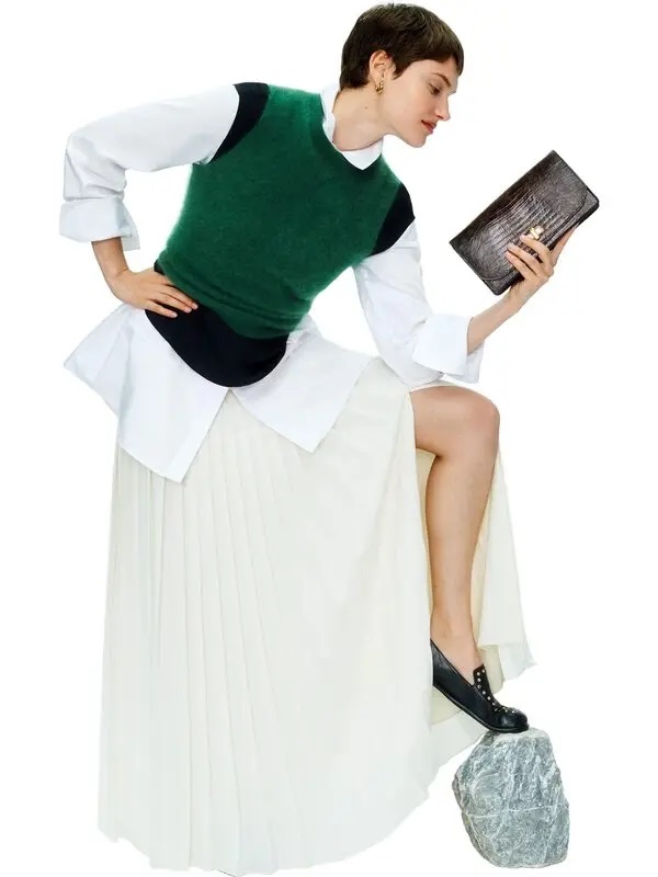Accessorize with minimalist jewelry to complement the brand’s clean aesthetic.