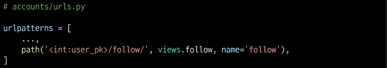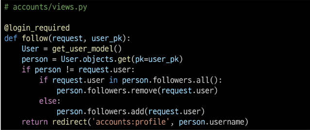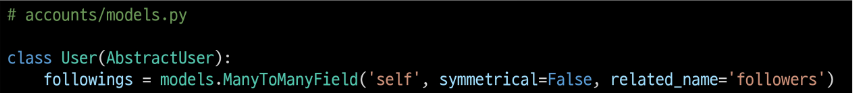 'self' : 유저와 유저와의 관계이므로 자기 자신을 모델로 삼는다.