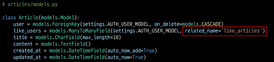 그래서 이를 해결하기 위해 ManyToManyField의 두번째 인자에 related_name을 사용하여 이름을 바꿔주자.