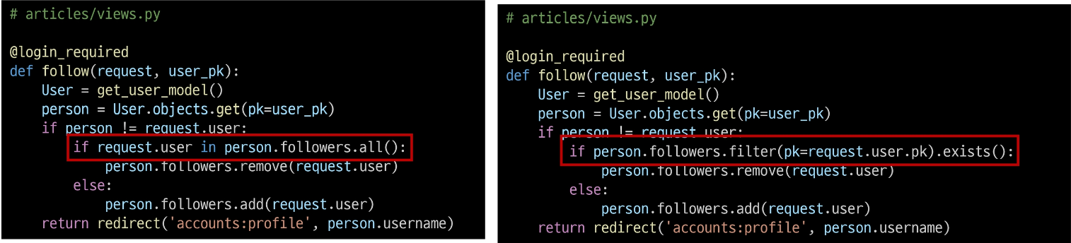 QuerySet에 결과가 포함되어 있으면 True, 없다면 False를 반환, 큰 QuerySet에 있는 특정 객체 검색에 유용