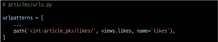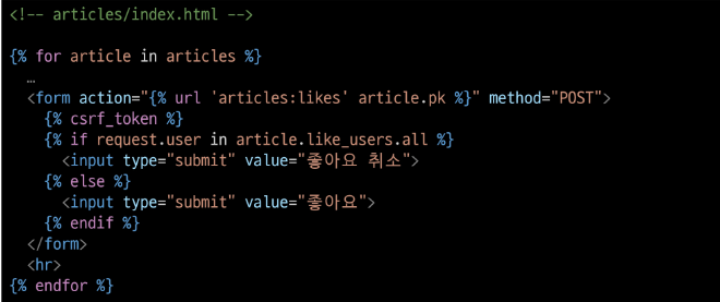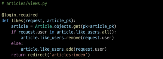 만약 종합병원에서 진료 예약 시스템을 만들어야한다고 가정하자. 한 명의 의사는 여러 환자의 진료 예약을 받을 수 있고, 한 명의 환자 또한 여러 의사의 예약을 신청할 수 있다. 동시에 예약을 남길 수 있다면 Foreign Key 자리에 1, 2 와 같은 값이 들어가야하는데, 이는 DB 구조상 불가능하다. 이를 해결하기 위해서는 예약 테이블(중개 모델)을 만들고 ManyToManyField를 사용하는 것이다. 그럼 좋아요 기능을 구현하러 가보자.