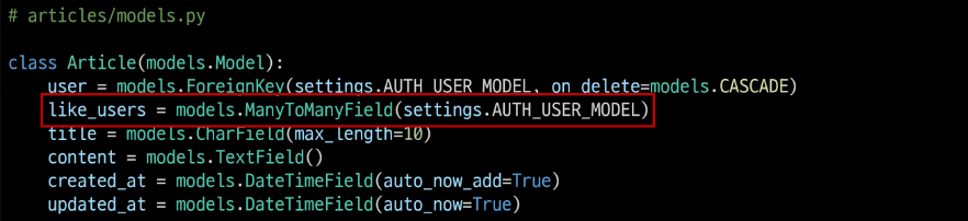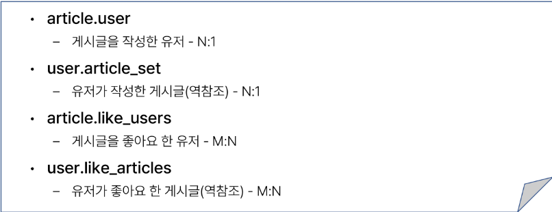 우린 Article과 User와의 관계에서 좋아요 기능을 추가함으로써 참조와 역참조 키워드를 정리해두자.
