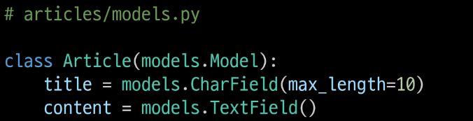 Article이라는 테이블(표)를 만들 것인데, 각 열의 요소는 title, content로 구성되어 있다.