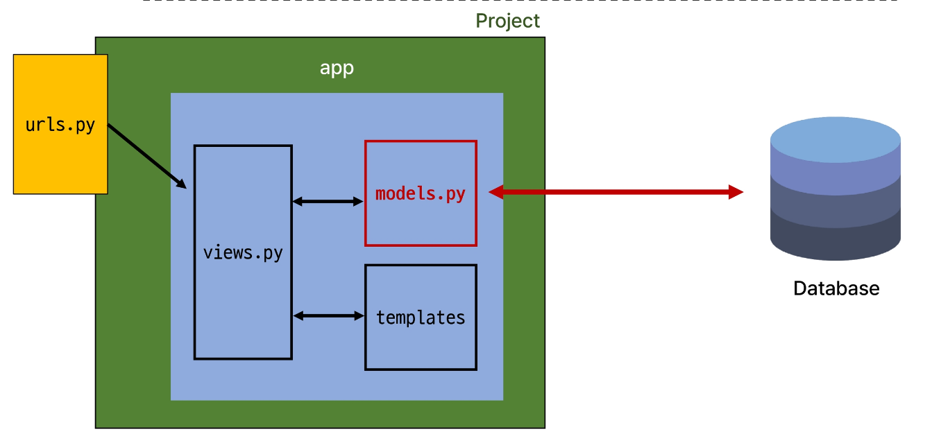 이를 모아둔 공간을 DB(database)라고 하는데, 이는 Django가 자동으로 만들어준다. 프로젝트 생성을 하면 manage.py와 함께 db.sqlite3 라는 파일이 자동으로 생성되는데 이 것이 바로 DB이다. 그럼 이러한 DB를 관리하려면 어떻게 해야할까? -> models.py를 사용한다. 아래 그림으로 구조를 확인해보자.