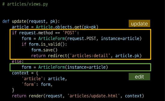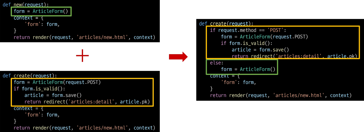 아주 중요한 CRUD의 과정을 ModelForm을 활용하여 진행해보았는데, 사실 의문이 드는 것이 있다. new, create 두 함수는 결국 게시글 생성의 역할을 하고, edit, update는 게시글을 수정하는 역할을 한다. 두 함수를 하나로 합칠 수 없을까? url -> view -> html 의 순서로 진행되니 합친다면 훨씬 효율적인 코드가 될 것이다. 파이썬의 기술로 한 번 합쳐보자. new와 create의 차이는 new는 GET 요청, create는 POST 요청에 대한 처리를 담당하고 있기 때문에 이로 구분하면 될 것이다.