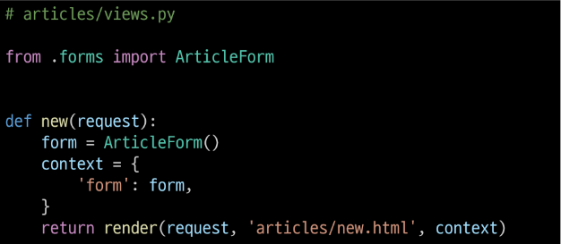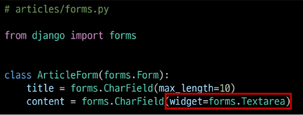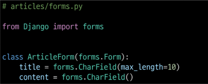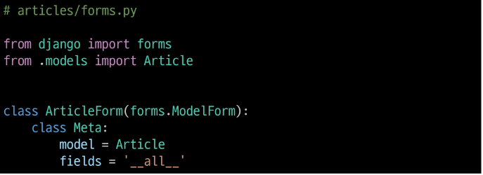 먼저 App 안에 forms.py 파일을 만들고 form class인 ArticleForm을 들고온다.