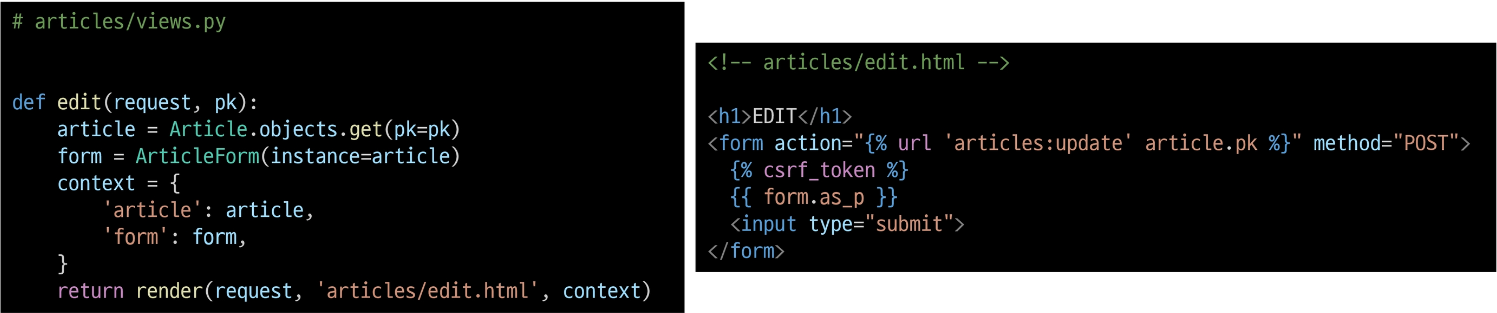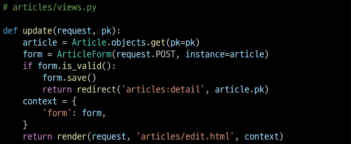 이제 코드의 길이가 늘어나더라도 보는 눈이 높아졌을 것이니 겁은 먹지 말고 두 가지에 집중해서 보자. 첫째, ArticleForm() 의 인자에 request.POST 이다. 파이썬 OOP 시간에 클래스 뒤의 인자는 인스턴스의 속성값을 넣는 것으로 알고 있다. 그렇다면 이해가 쉽지 않은가? 우리는 ModelForm 을 사용하여 사용자의 입력값을 받고 이는 DB에 저장될 것이기 때문에 request의 POST 값으로 입력받을 것이며 그 안에 속성값들이 다 들어있을테니, request.POST의 형태로 인자에 들어가게 된다. 둘째, if form.is_valid(): 라는 부분인데 "유효성 검사" 라는 5글자가 떠오른다면 정답이다. 우리가 form을 사용하는 가장 궁극적인 목적은 유효성 검사였음을 잊으면 안된다. 그렇다면 Django의 깊은 어딘가에서 유효하지 못한 data가 들어왔을 때 error message를 반환해줄 것이다. 그래서 (올바른 data라면) -> (저장해) 의 로직인 셈이다.