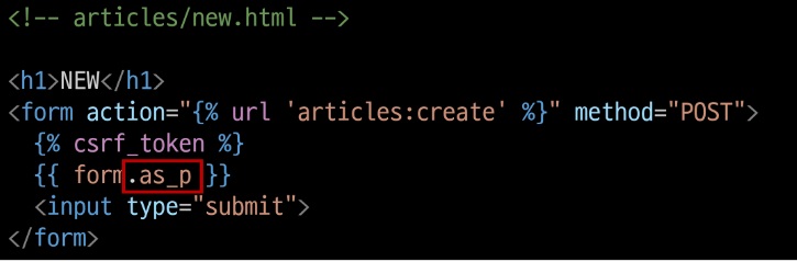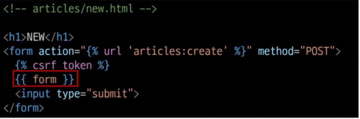어라? 그렇다면 위에서 작성한 form은 title, content를 기록하는 article이므로 DB에 저장되어야하니 ModelForm으로 바꿔야겠네 -> 정답