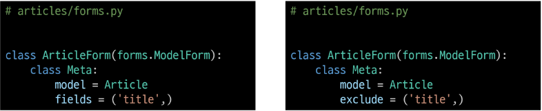 신기한 것은 내가 전에 정의해둔 Article class를 가져와서 적용해줬기 때문에 fields를 따로 정의하지 않았다. 그런데 받아올 때 class Meta를 적게 되는데 우리가 Django의 깊은 내장 코드에 깊이 관심을 가지지 않기로 했기 때문에 넘어가도 되는 부분이지만 쉽게 말해, Meta class는 ModelForm의 정보를 작성하는 곳이라고 생각하면 된다. 혹시 제외하거나 특정 fields만 가져오고 싶다면 fields 속성을 조작하면 된다.