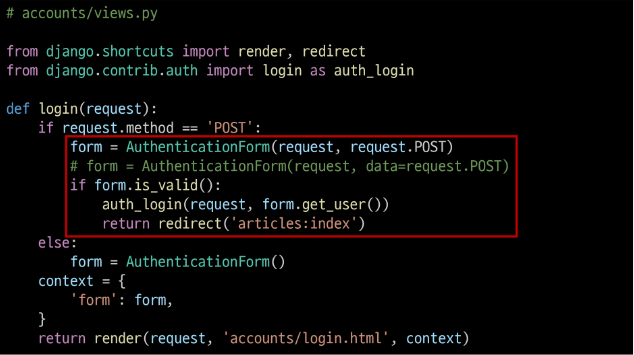 AuthenticationForm 을 통해 인증된 사용자를 로그인하는 함수