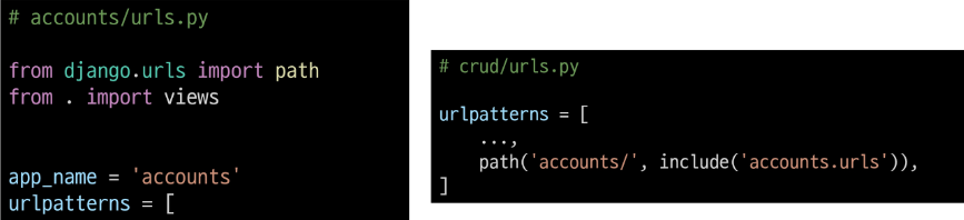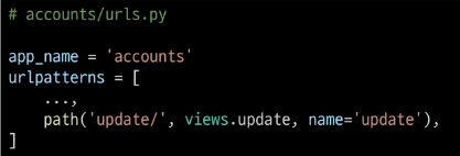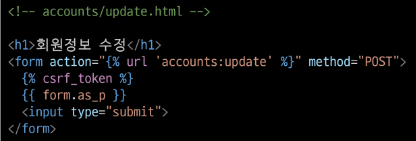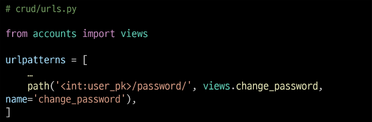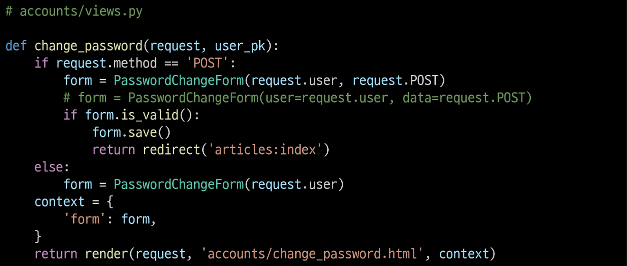 짚고 넘어가야할 내용은 2가지로 보인다. 첫째 비밀번호는 DB에 저장될까? 그렇다면 ModelForm일텐데? Form이네? 그렇다 비밀번호는 DB에 그대로 저장되지 않는다. 둘째는 비밀번호 변경에 대한 url은 project urls.py에 작성함을 볼 수 있다. 이를 주의하자.