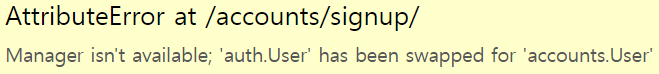 이러한 오류가 발생하게 된다. 읽어보면 우리가 바꾼 User모델인 CustomUsermodel이 아닌 기존 Usermodel을 참조하고 있다고 한다. 생성 과정과 우리가 아직 만들지 않았지만 수정 과정은 ModelForm을 사용하기 때문에 이는 자동으로 Meta 클래스에서 User를 참조하고 있으므로 Custom을 통해 Meta의 model을 수정해야한다.