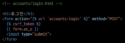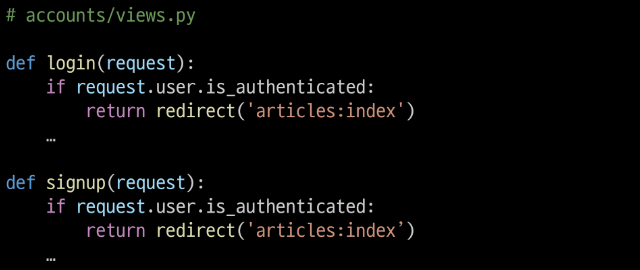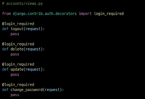 CRUD 과정에서 익숙한 형태의 코드일테지만 views.py의 내용은 중요하고 많다보니 같이 들여다보자. 우리는 로그인이라는 기능 또한 django의 auth가 제공하는 기능을 사용할 것이니 login이라는 것을 import 받는데 우리는 login이라는 이름의 view 함수를 사용할 것이므로 이름을 auth_login으로 수정하며 시작하자. 유저의 입장에서 로그인이라는 페이지로 들어오면 이는 GET 요청으로 비어있는 AuthenticatedForm을 제공할 것이다. 그럼 유저는 빈 폼에 아이디와 비밀번호 정보를 입력하여 제출을 할 것이며 이는 POST요청이 될 것이다. 그럼 입력받은 정보를 담은 폼을 유효성 검사를 거친 후 로그인을 시키는데 이때, 필요한 인자는 request와 form.get_user() 2개이다. 그리고 로그인 완료 되었으면 INDEX 페이지로 돌려보내자.