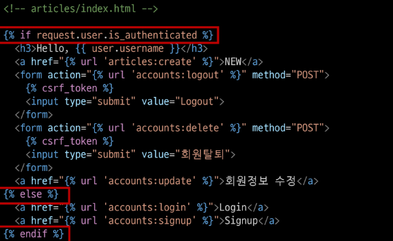 DTL의 조건문을 활용하여 로그인 상태 여부를 간접적으로 확인할 수 있도록 설정. 하지만 url로 접근하는 것은 막을 수 없기 때문에 한 가지 조건을 더 달아주자.