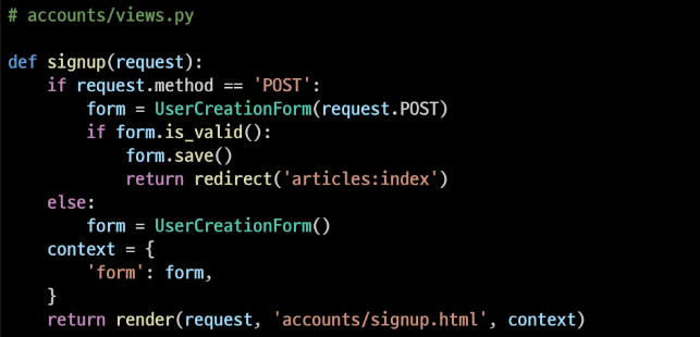 우리가 처음 ModelForm을 학습할 당시를 떠올려보면 그 기준이 생각날 것이다. 로그인이라는 과정은 조회에 해당하지만 회원가입은 생성에 해당하여 DB에 저장해야할 것이다. 이렇게 DB에 영향을 주는 기능은 ModelForm을 활용하기로 했었다.