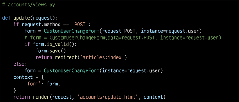 게시글의 수정과 비슷하게 instance 인자를 사용하고 있는 모습이고, ModelForm에 대한 설정을 다시 보자면 비밀번호 수정을 넣지 않았다. 하지만 수정을 들어가보면 비밀번호 수정란이 뜨는 것을 볼 수 있다. 이는 Django에서 따로 관리하기 때문인데 수정을 하면 Error 화면을 보여준다. 이를 해결하러 가보자.