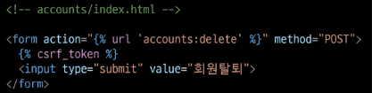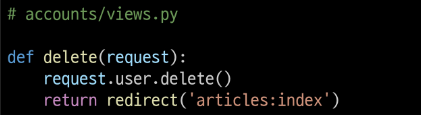 한 가지만 언급하고 넘어가겠다. POST 요청 보내는 request에 담겨있는 회원 정보를 지우고 싶다면 request.user로 접근하면 된다.