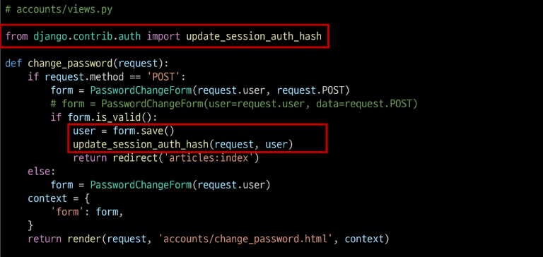추가로 혹시 비밀번호를 변경하면 기존 세션과의 정보가 달려저서 로그아웃 처리됨을 알 수 있는데 난 변경을 해도 로그아웃 상태를 유지하고 싶다고 한다면 update_session_auth_hash 메서드를 사용해볼 수 있다.