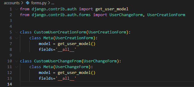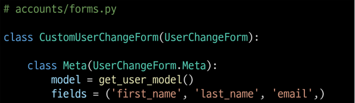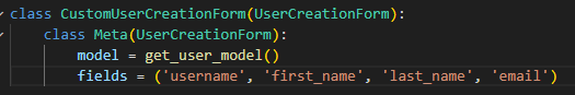 이정도면 충분한 것 같다. 위에서 get_user_model()로 우리는 모델을 참조하고 있다 분명 models.py에서 정의한 User 클래스를 써도되고, settings.py의 AUTH_USER_MODEL을 참조해도 되지만 이 또한 권장사항으로 get_user_model()을 사용하자 이는 메서드이므로 괄호를 붙여야 한다. 정확한 의미는 "현재 프로젝트에서 활성화된 사용자 모델"을 반환하는 함수이다.