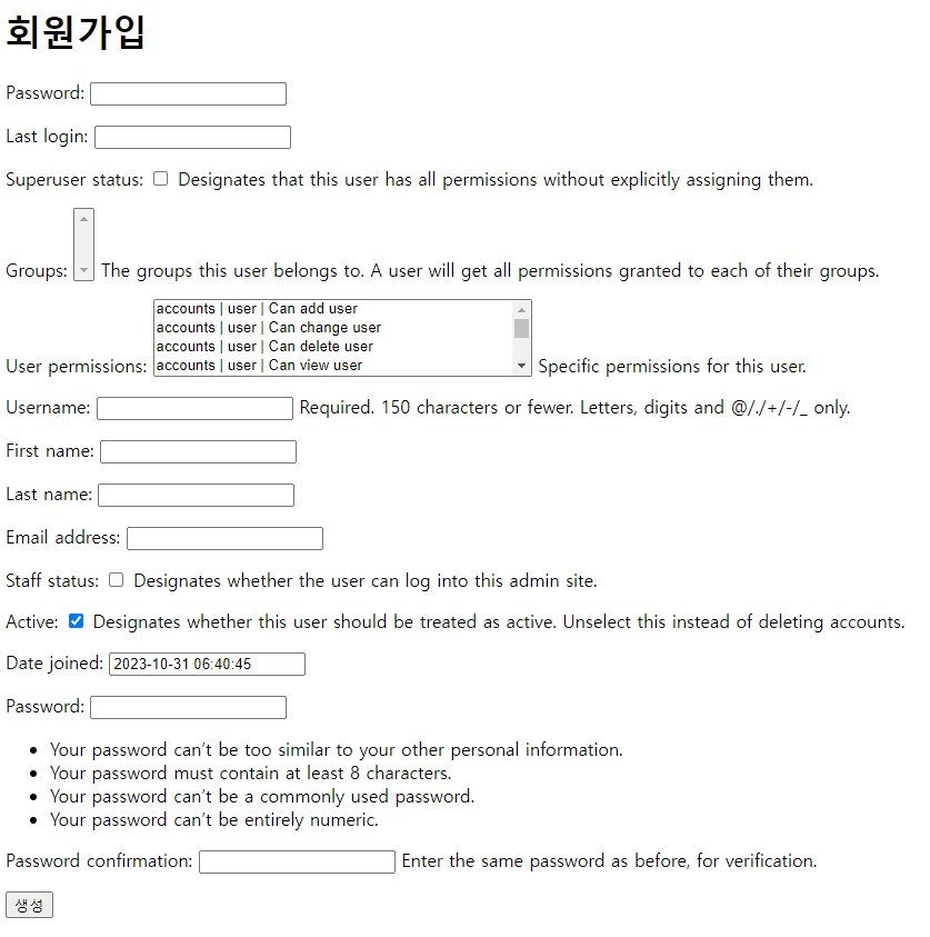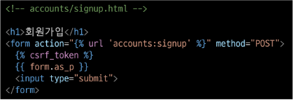 회원가입시 사용자 입력 데이터를 받을 built-in ModelForm