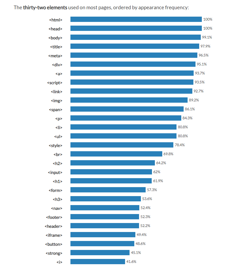 태그에는 상속을 받는 태그와 상속이 되는 태그들이 존재 한다. 대표적인 태그가 바로 ol/ul태그(상위14위)와 li태그(상위13위)이다. 여기서 볼 수 있듯이 반드시 그런 것은 아니다. 실제 데이터를 통해서 볼 때에 li태그의 빈도수가 높은 것으로 보아 단독으로 사용될 수도 있지만, 보통 ol/ul태그 안에서 사용된다. 여기서 ol태그는 순서가 있는 목차태그이고, ul태그는 순서가 없는 목차태그이다.