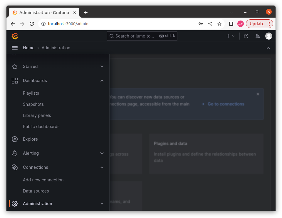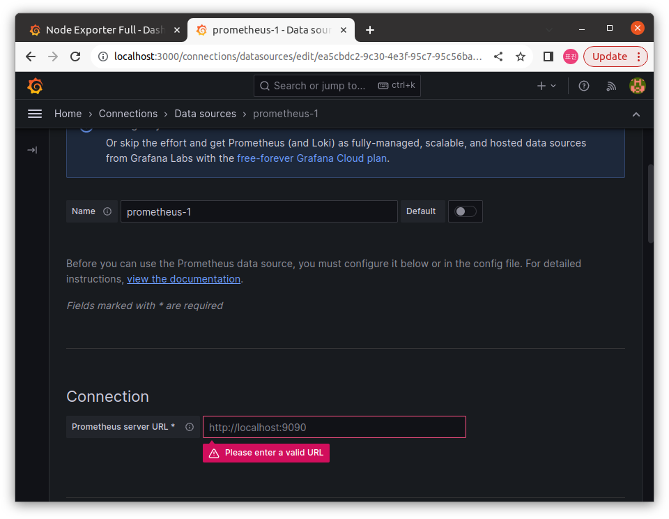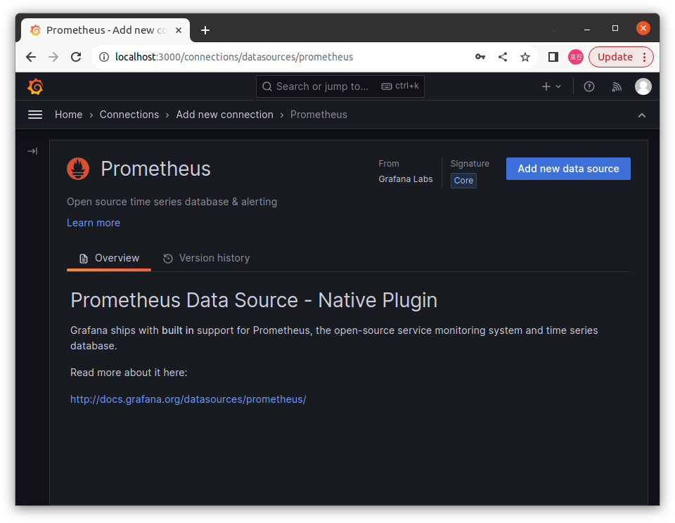목록의 Connections > Add new connection 선택, Prometheus 검색