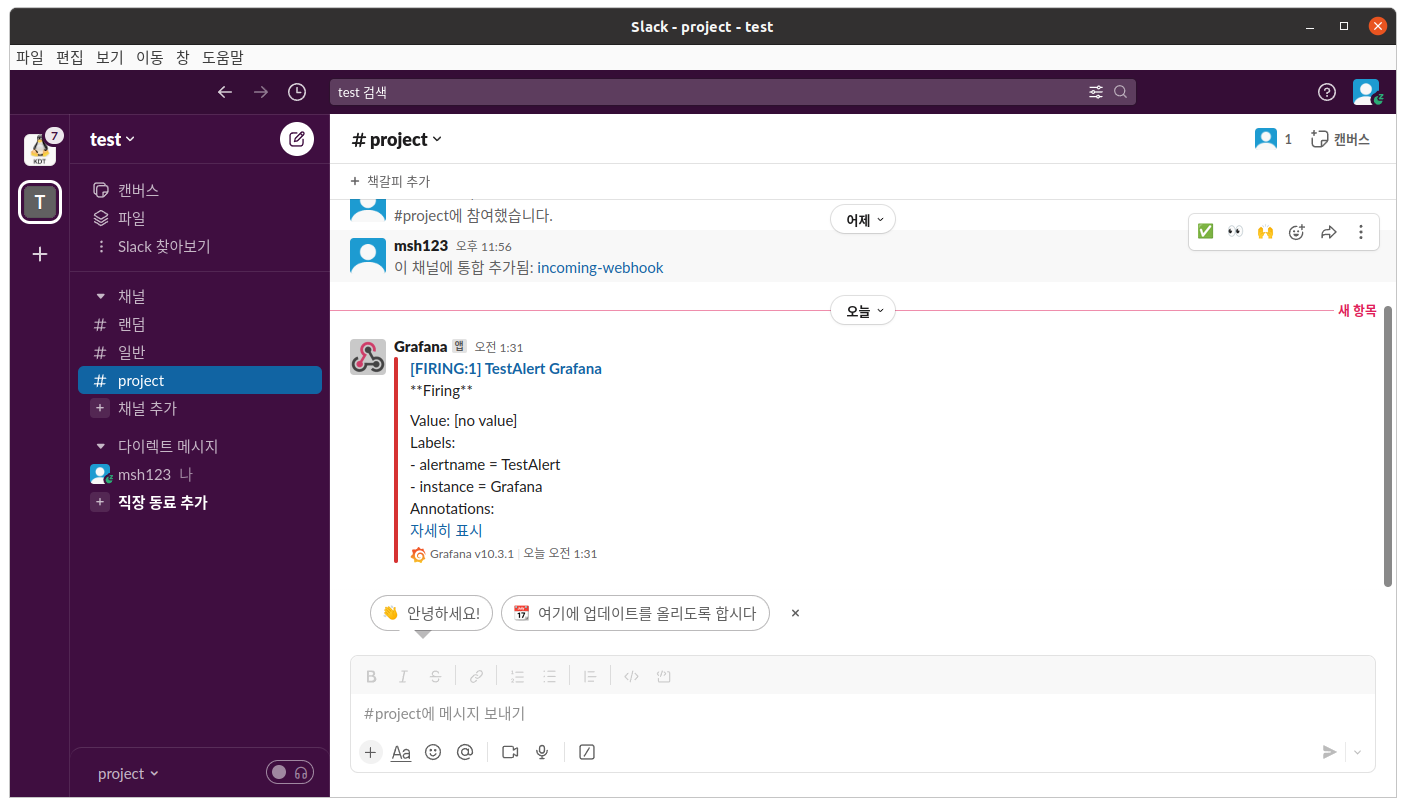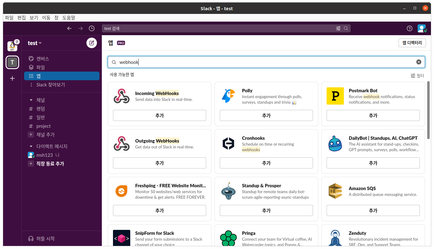 앱 메뉴에 webhook 검색, Incomming Webhooks 채널에 설치