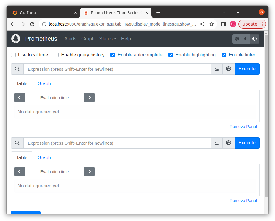 Prometheus 접속 및 확인Expression에 100 * (1 - ((node_memory_MemFree_bytes + node_memory_Cached_bytes + node_memory_Buffers_bytes) / node_memory_MemTotal_bytes)) 입력해 동작 확인)Grafana 접속 및 확인admin/admin)