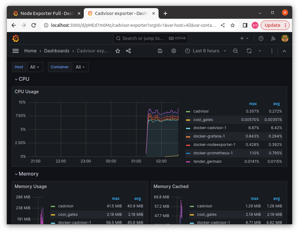 Node Exporter를 실행한 가상머신에서 다음 명령 실행docker run --volume=/:/rootfs:ro --volume=/var/run:/var/run:ro --volume=/sys:/sys:ro --volume=/var/lib/docker/:/var/lib/docker:ro --volume=/dev/disk/:/dev/disk:ro --publish=8080:8080 --detach=true --name=cadvisor google/cadvisor:latest