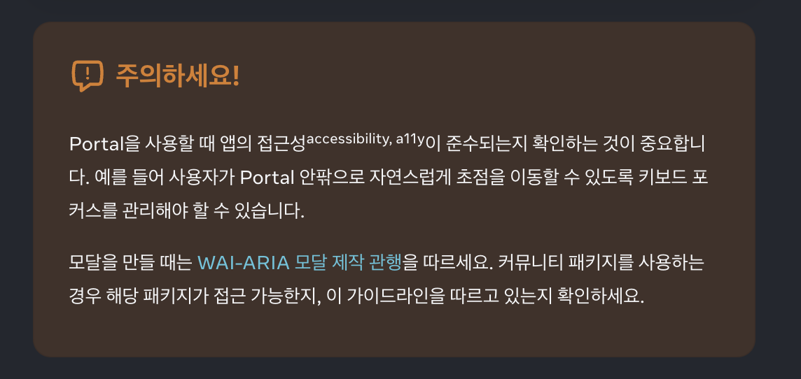 React Portal은 시각적으로는 잘 보이지만, 보조 기술(스크린리더, 키보드) 사용자에게는 안 보일 수 있다. 따라서 WAI-ARIA 가이드라인을 따르고, a11y를 테스트하는 것이 중요하다.