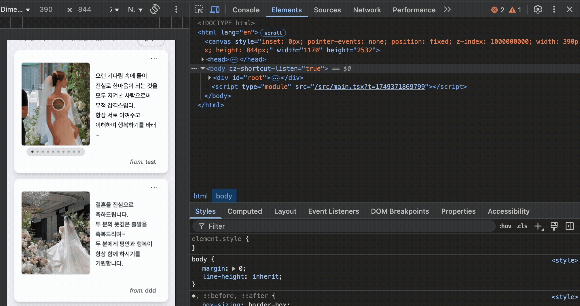 이 모달을 열고 닫을 때마다, 개발자 도구 요소 탭에서 body