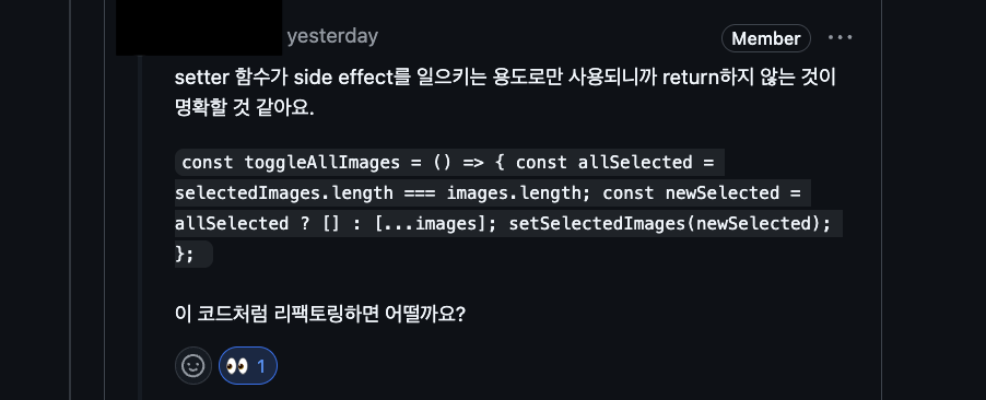 함수를 사용한 곳에서 아래와 같이 비슷한 코드 리뷰가 달렸다.
