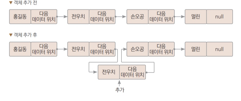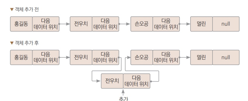 | LinkedList<E,> | 저장된 객체의 참조과정이 배열에 비해 복잡하다. | 저장 공간을 늘리는 과정이 간단하다. |