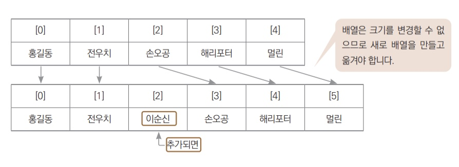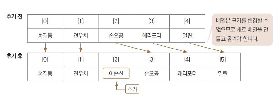 배열은 크기가 고정되어 있어 데이터를 추가하거나 삭제할 수 없다.